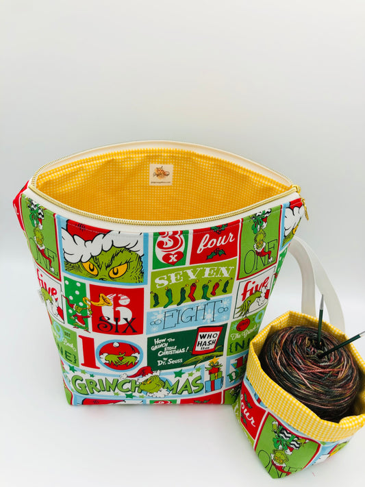 Grinchmas Knitting and Crochet Zipper Style Project Bag + Yarn Cozy | XL Sock Size