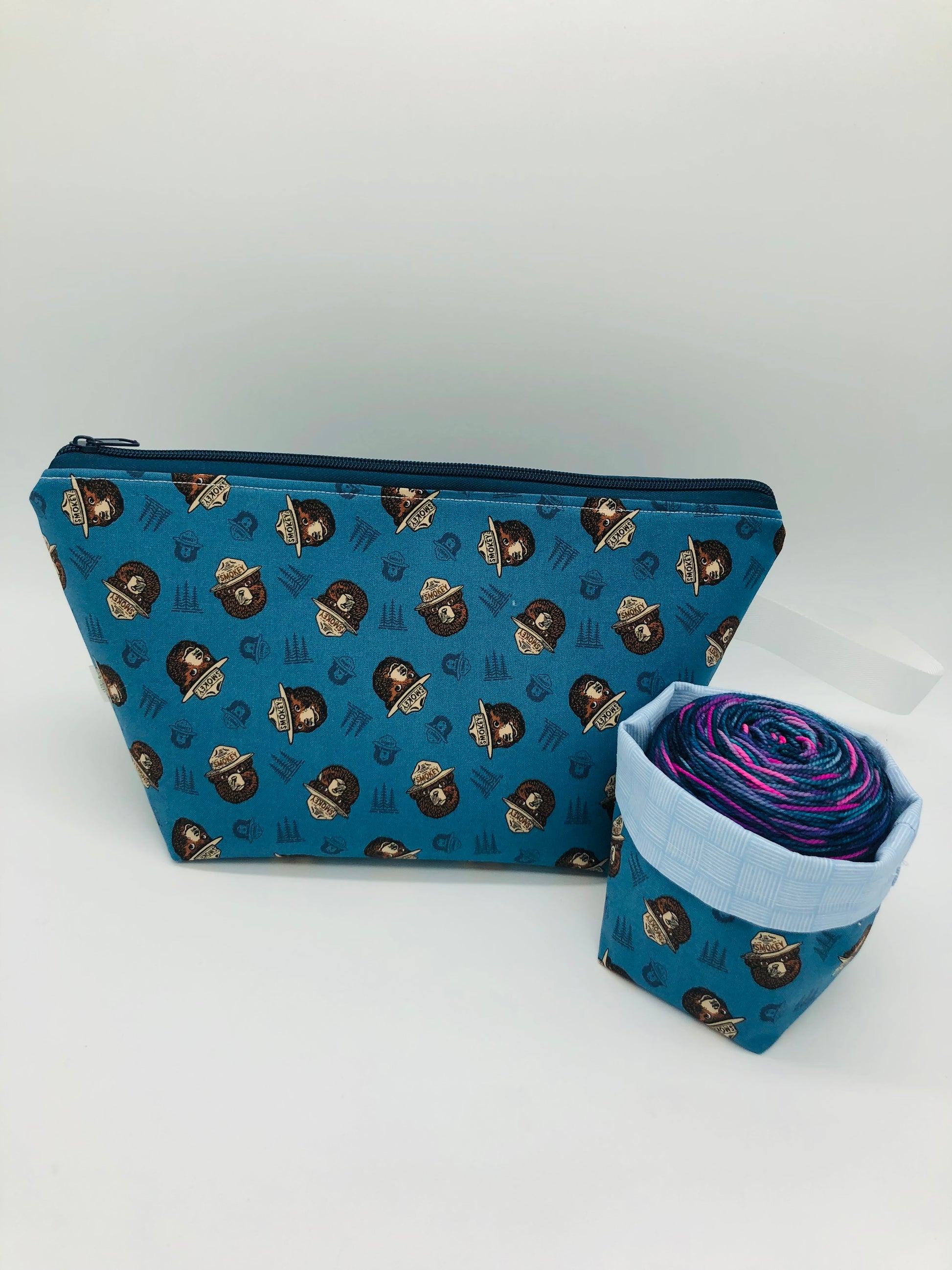 Blue Smokey Faces Knitting Crochet Zipper Style Project Bag + 100g Yarn Cozy| Shortie Sock Size