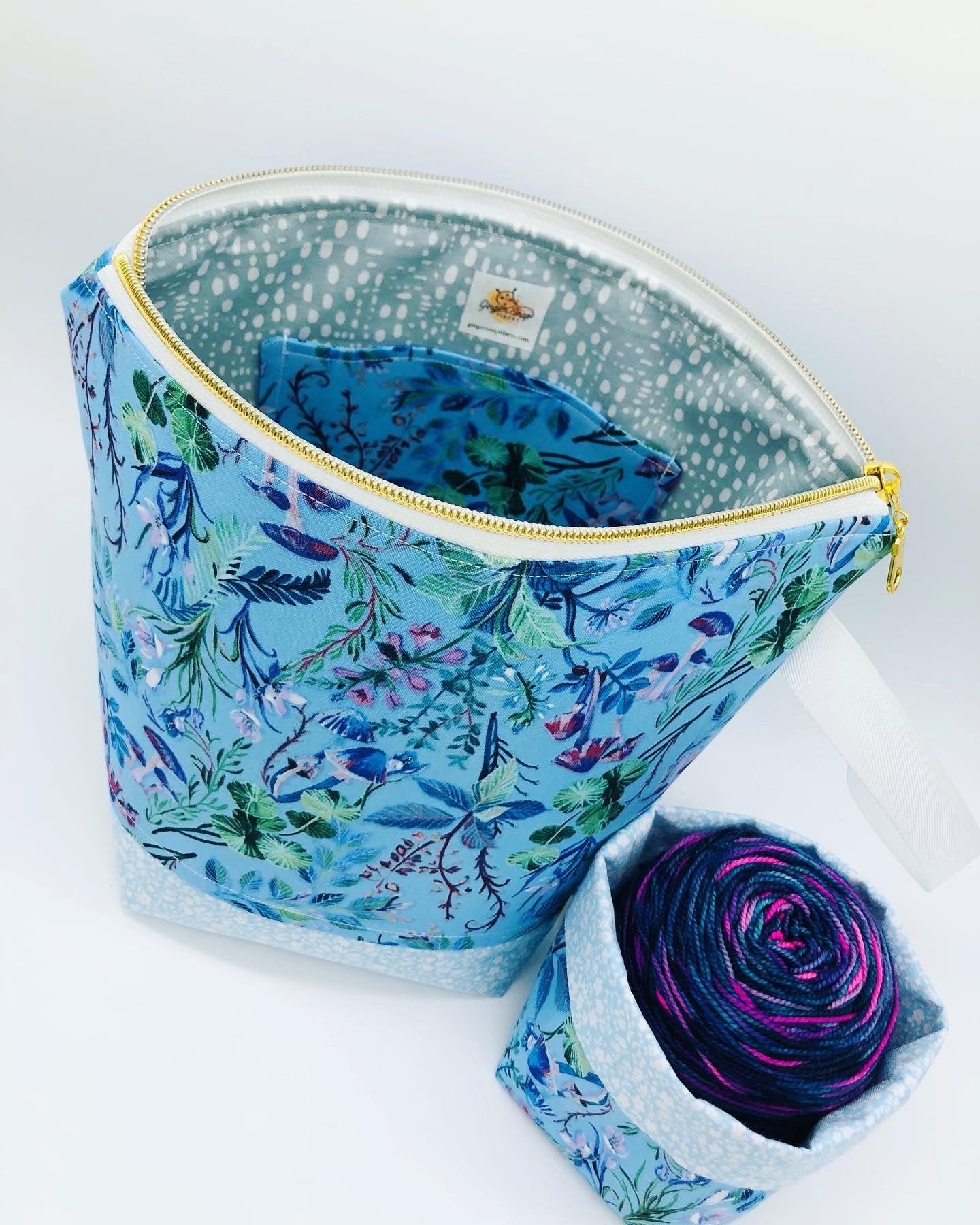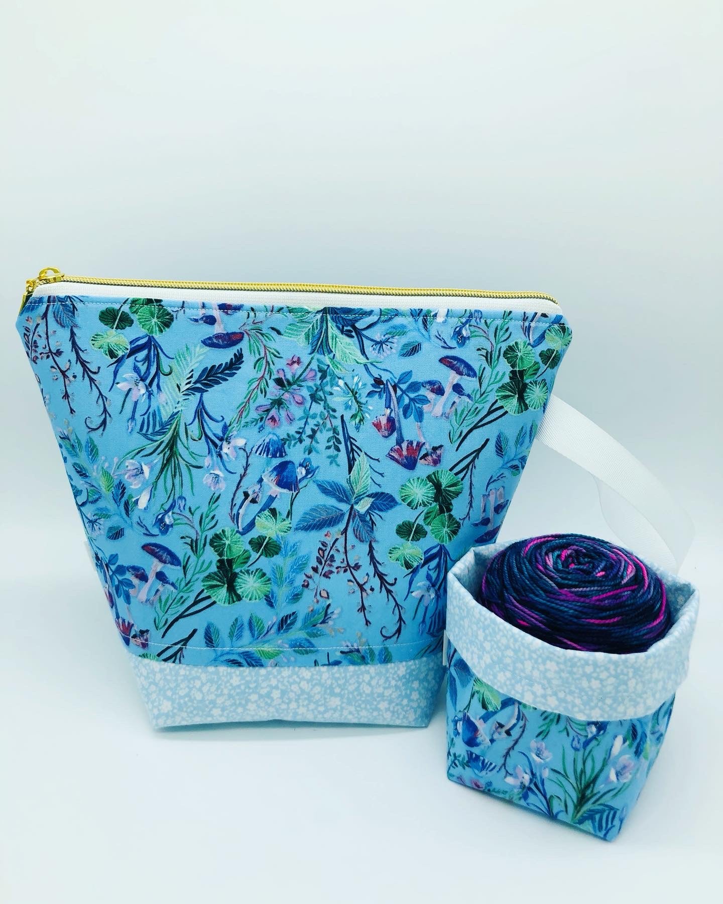 Enchanted Mushrooms (light) Knitting Crochet Zipper Style Project Bag + Yarn Cozy | Sock Size