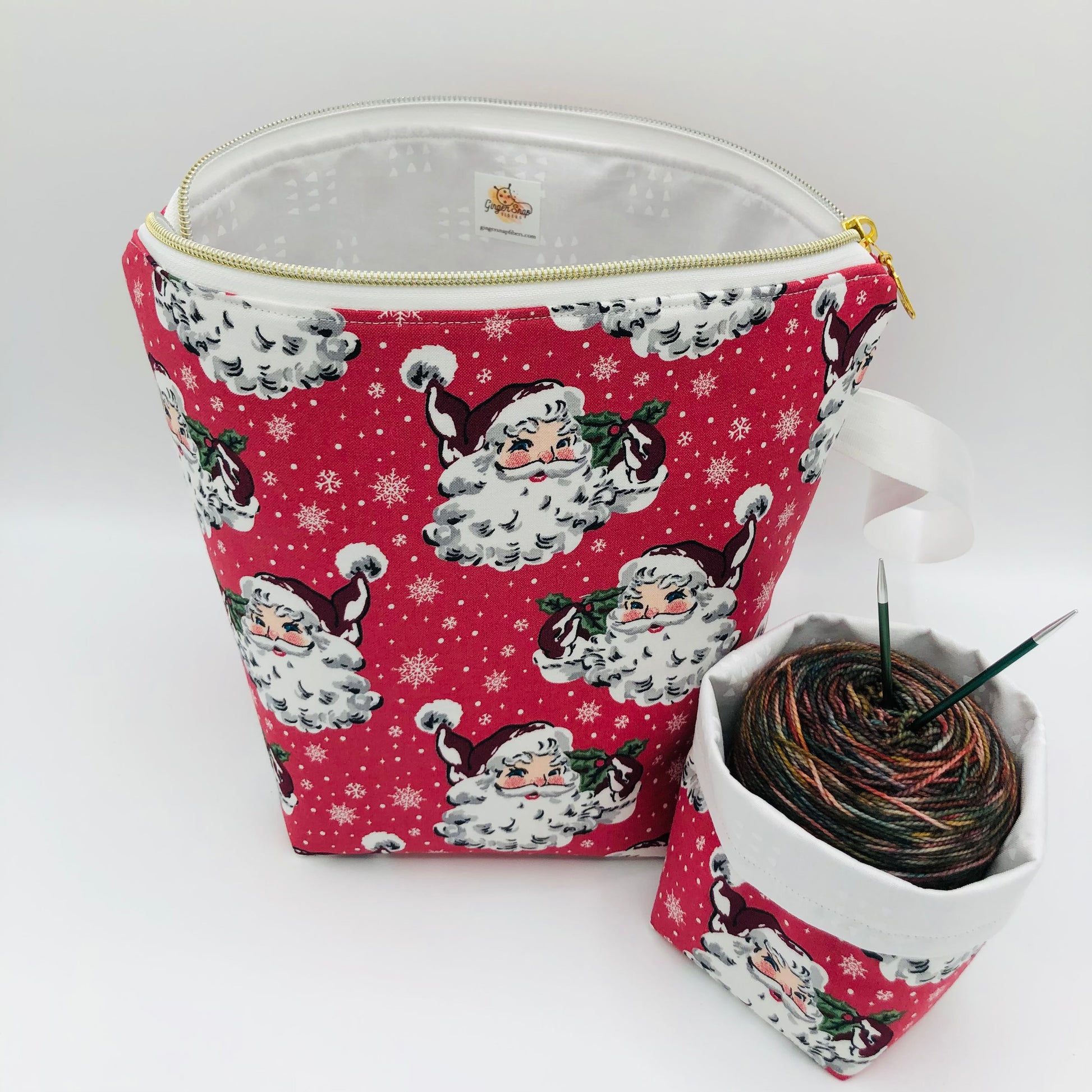 Pink Santas Holiday Knitting Crochet Zipper Style Project Bag + Yarn Cozy | Sock Size