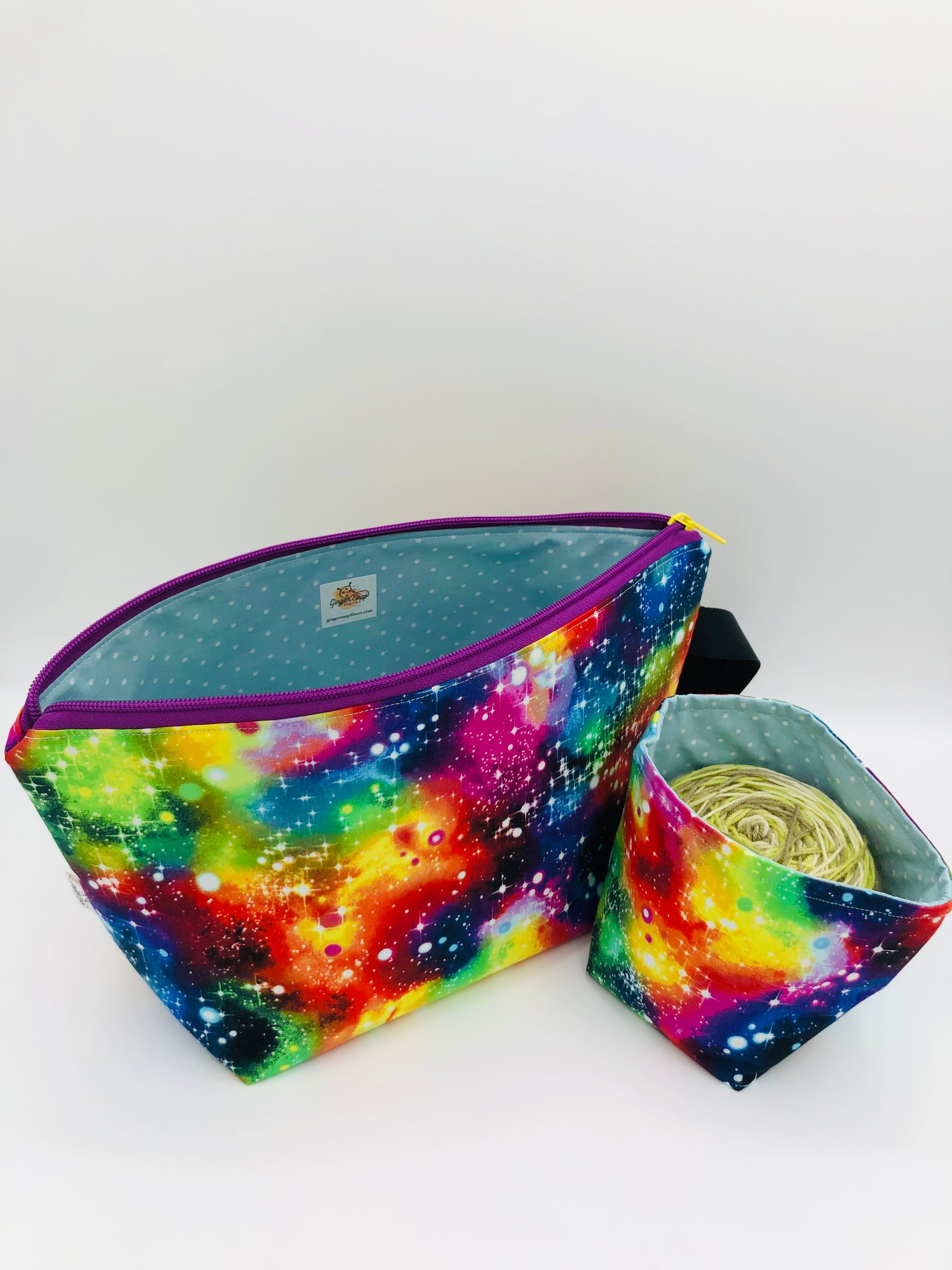 Rainbow Galaxy Knitting Crochet Zipper Style Project Bag + 100g Yarn Cozy | Shortie Sock Size