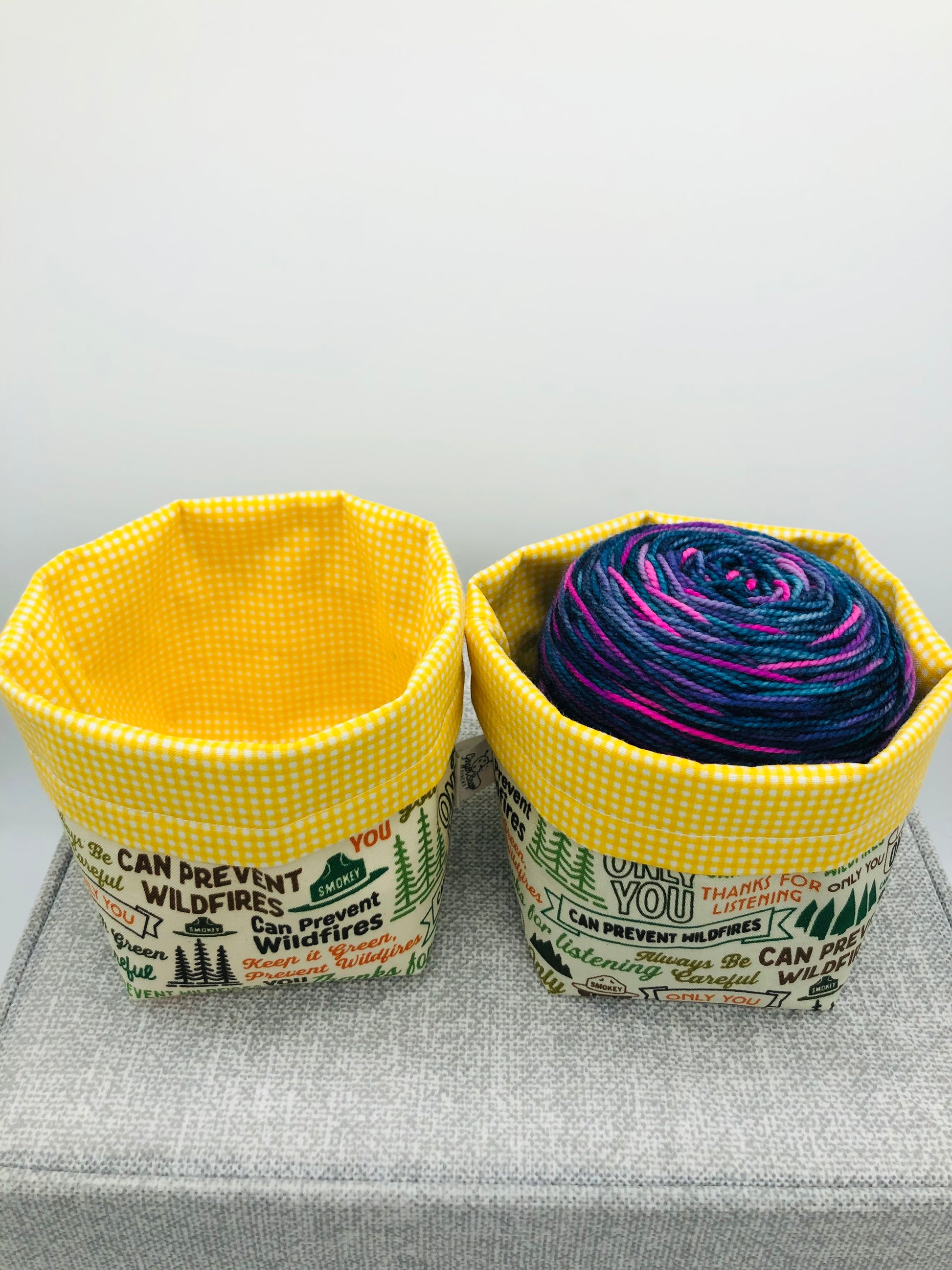 This set includes two cozies. Each cozy is made to fit most 100g yarn cakes.